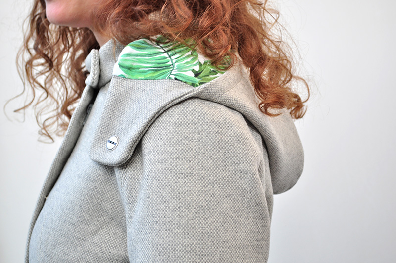 Misschien net daarom dat ik toch een soort van schaarste opmerk als ik in mijn kleerkast sta. Ik heb nood aan rust in mijn hoofd en aan een portie sober en effen, niet aan een kleurenbom. Vandaar. Een relatief sobere jas. In grijze wol, een paar jaar geleden gevonden op een stockverkoop van grotemerkenstoffen. Loodzware stof, heel vast geweven, bijna vilt. Lekker warm en geweldig om mee te werken. Overal met dubbel doorstikte naden, want die gingen wat bol staan door de dikte en waren moeilijk plat te strijken.